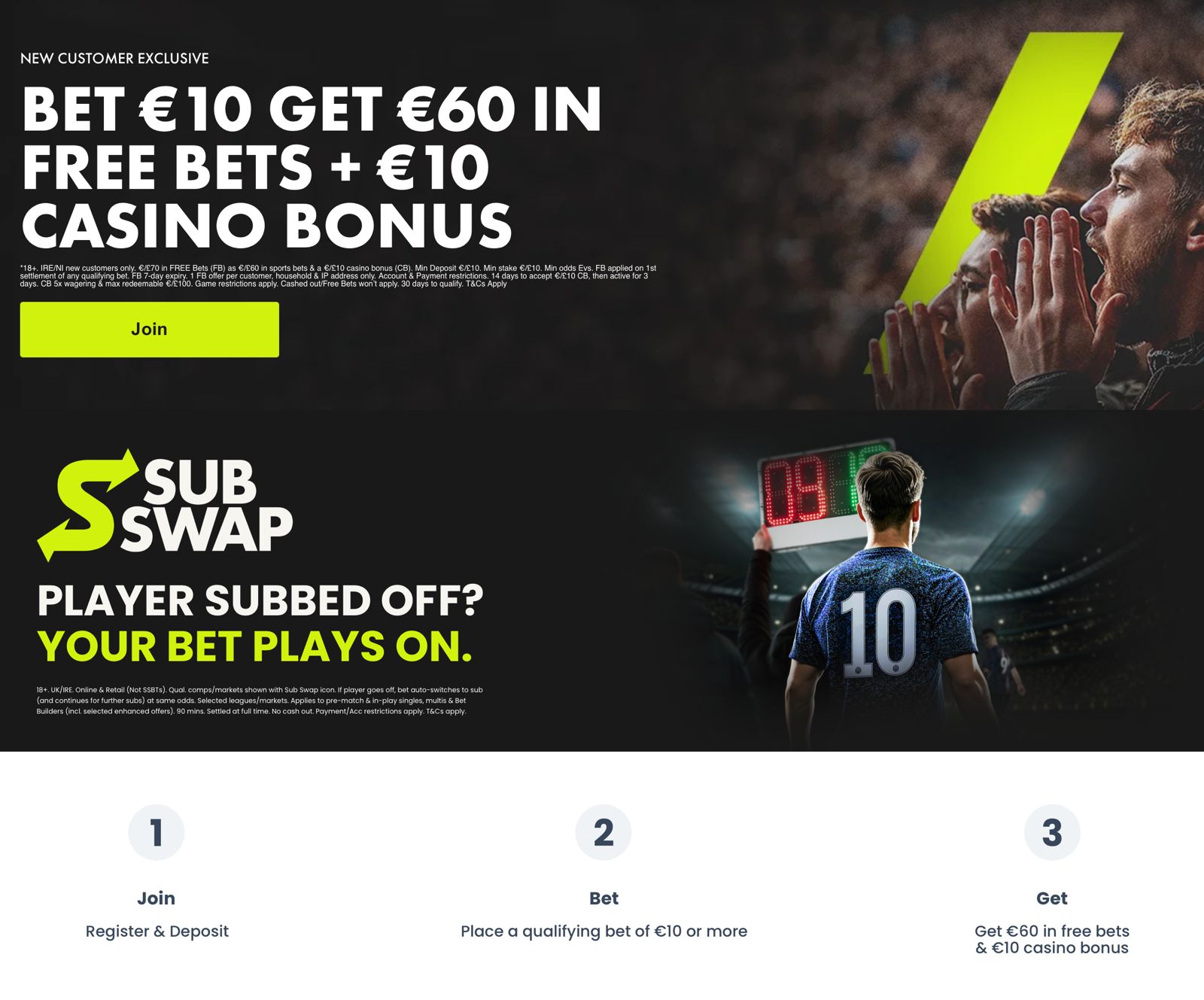 The welcome offer itself is a beauty. New customers from Ireland and Northern Ireland can Bet €10 and get €60 in Free Bets, along with a €10 Casino Bonus.